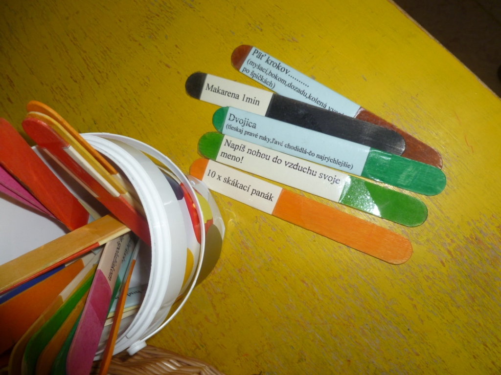 Počas hodiny, pri únave a strate pozornosti vyžrebujeme jednu paličku a v priebehu jednej minúty si zacvičíme alebo odreagujeme.