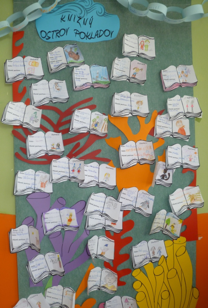 Počas roka žiaci v triede prezentujú knihy, ktoré čítajú doma. Z prezentácie urobia zápis a miniilustráciu a pripnú na ostrov pokladov v triede s témou mora. Za množstvo odprezentovaných kníh - odmena.