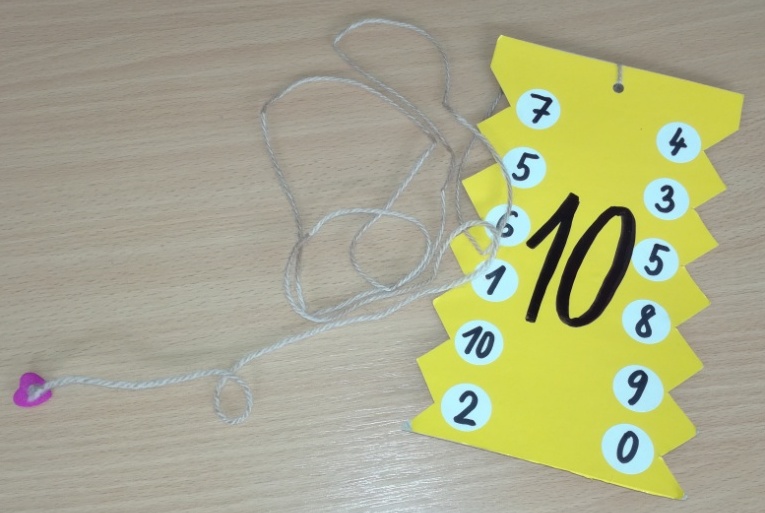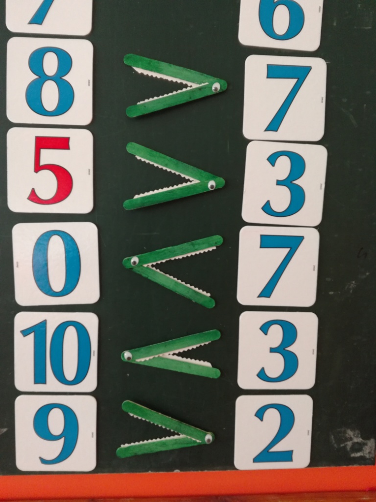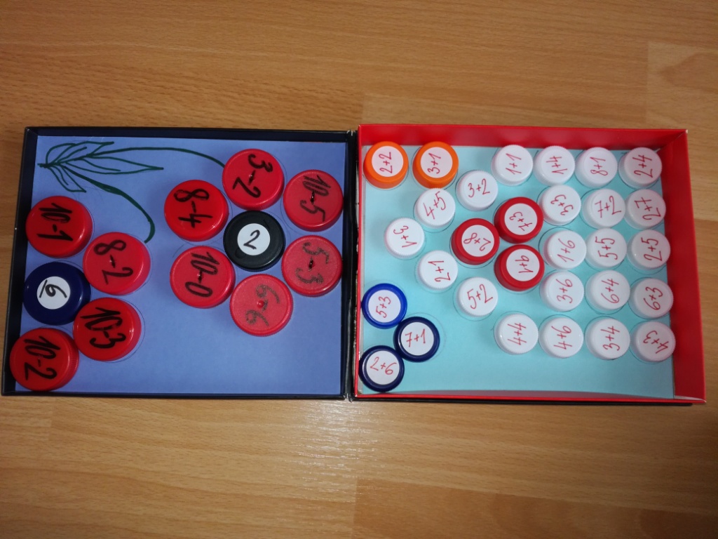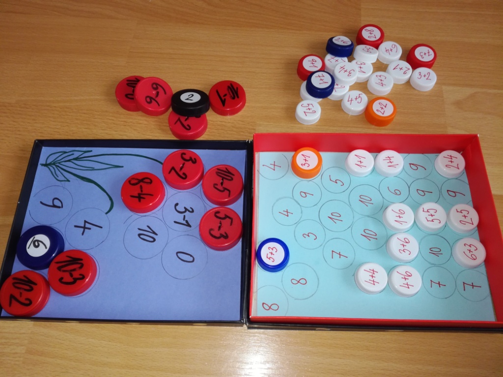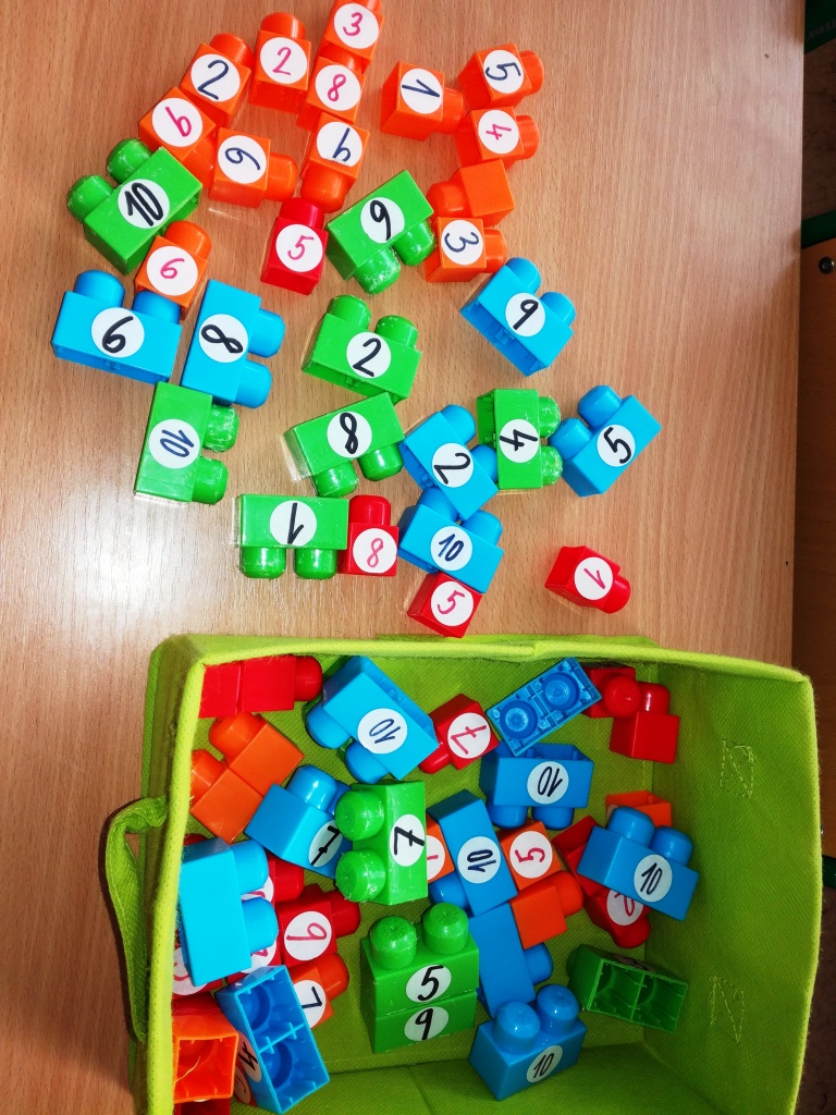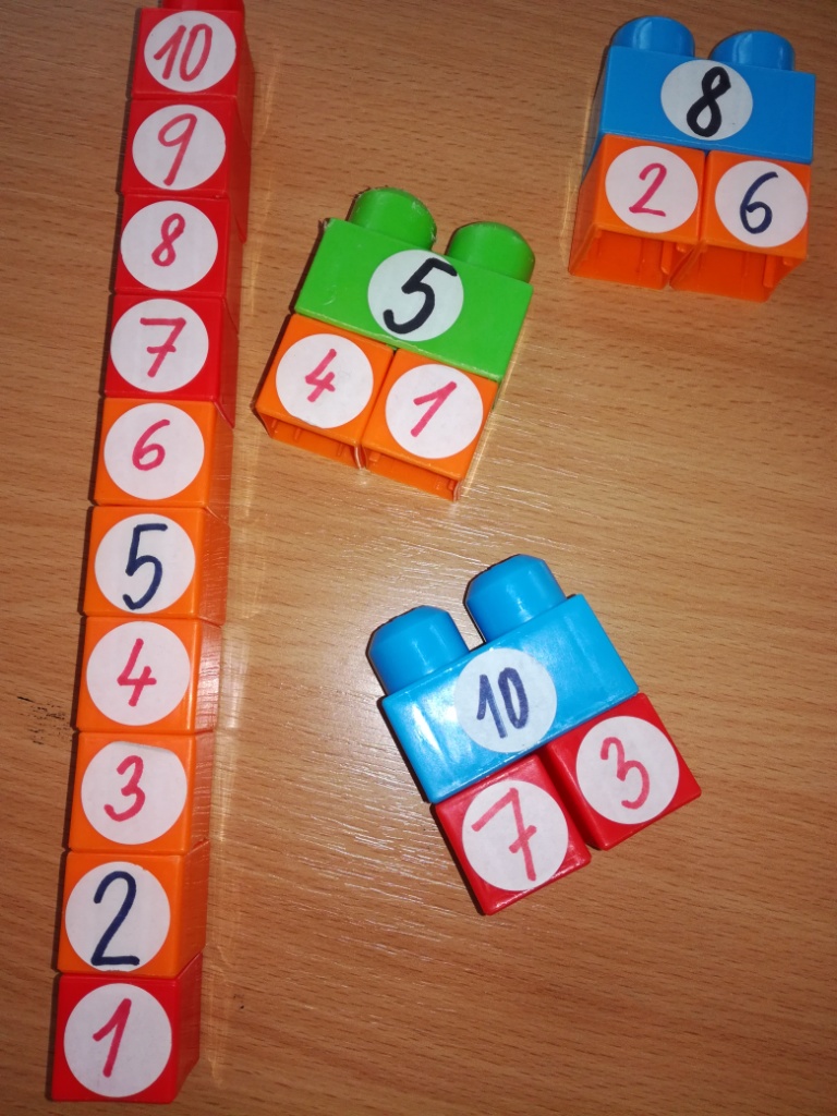 Veľké legové kocky polepené číslami. V úvode prvého ročníka deti skladajú rad čísel do desať, teraz robia rozklad čísla (k veľkej kocke priradiť dve malé) alebo sčítaciu rodinku.