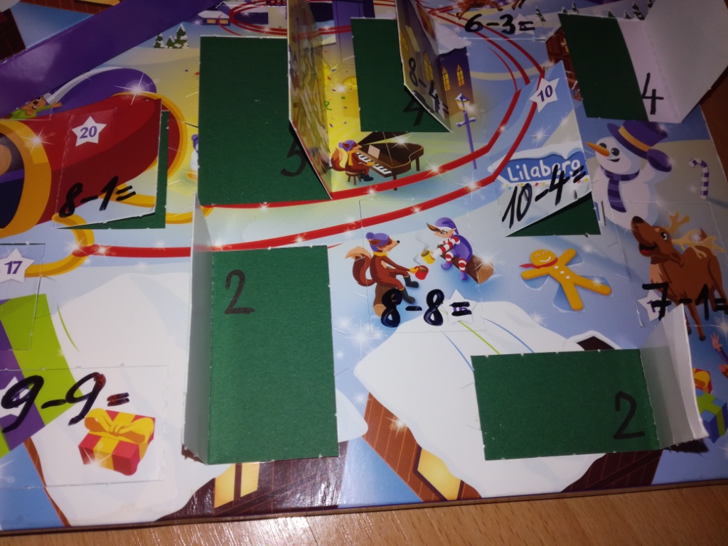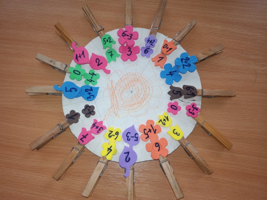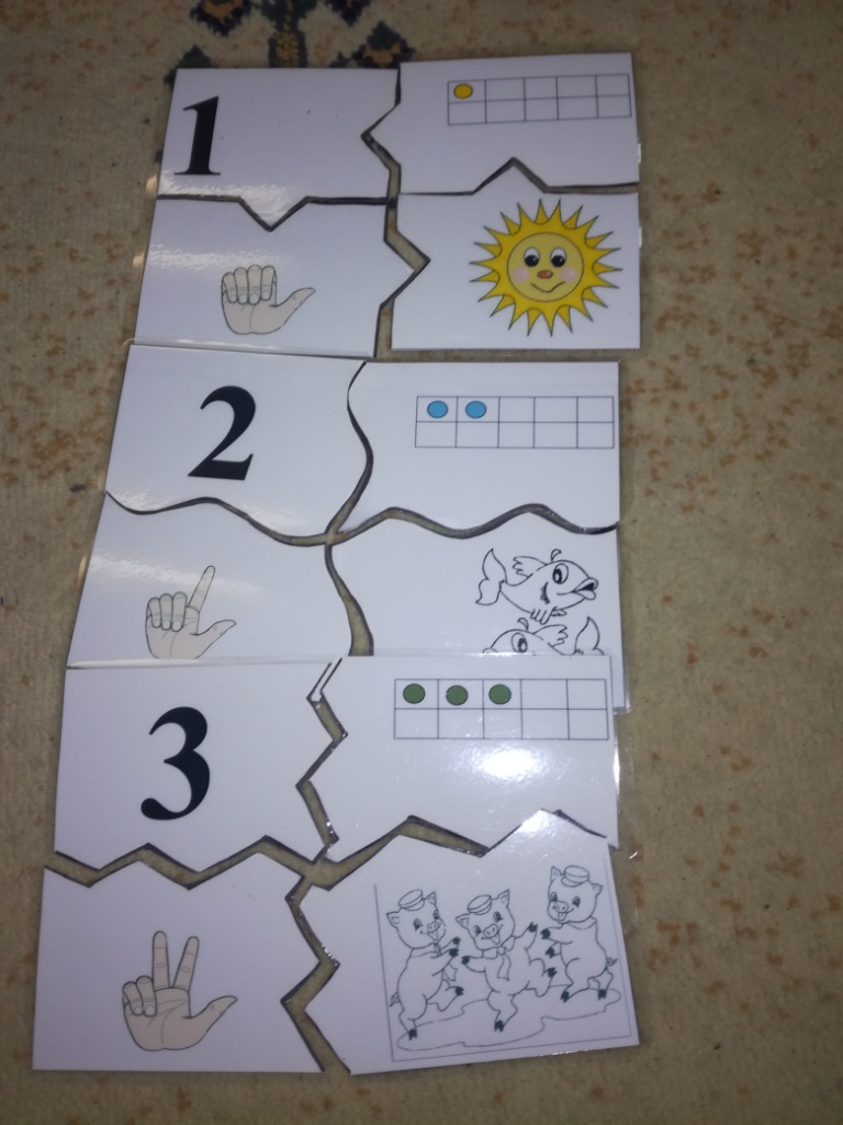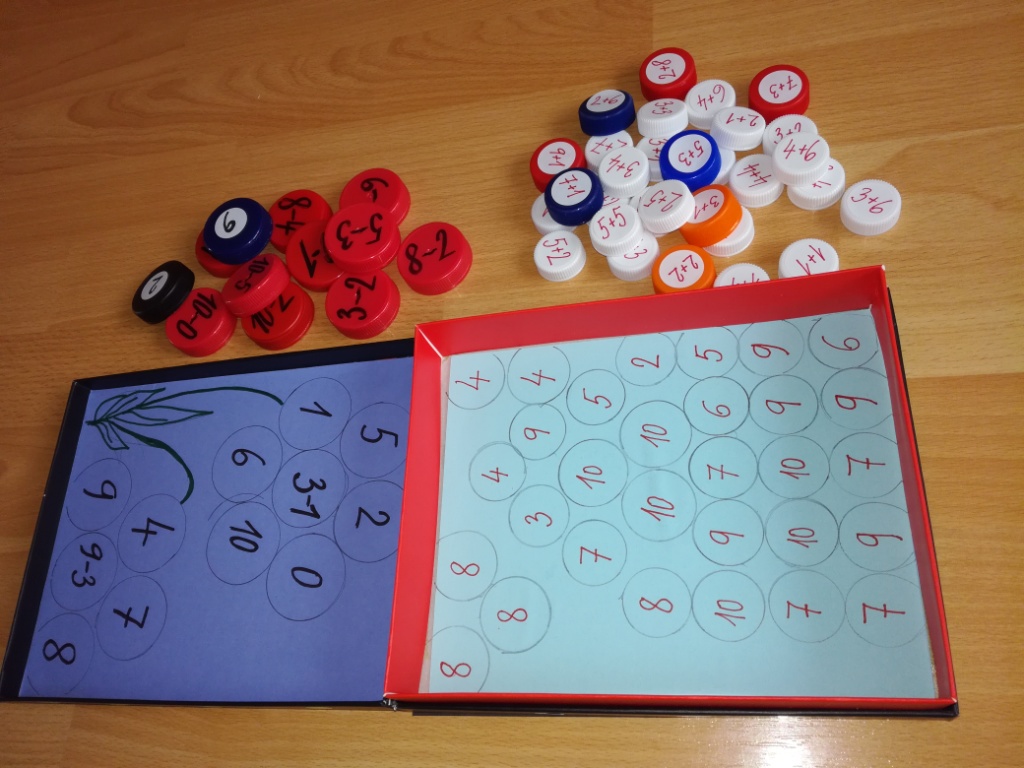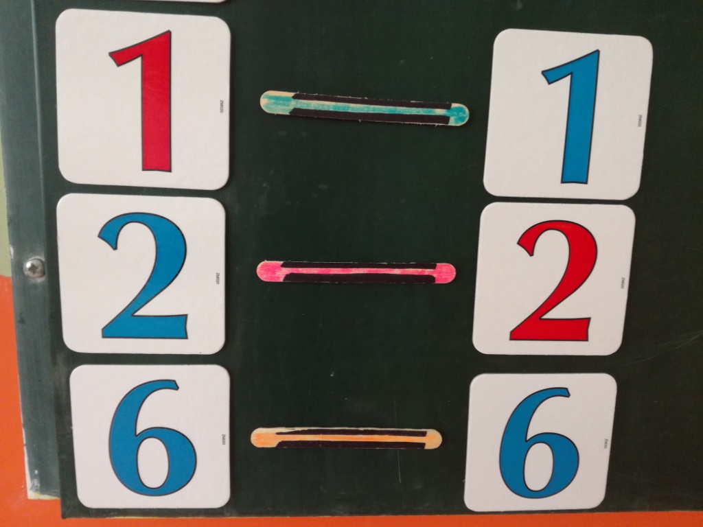 Veľké legové kocky polepené číslami. V úvode prvého ročníka deti skladajú rad čísel do desať, teraz robia rozklad čísla (k veľkej kocke priradiť dve malé) alebo sčítaciu rodinku.