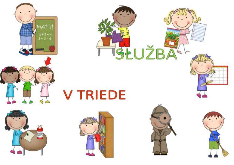 Plagát s obrázkami povinností služby v triede. V strede sa menia kartičky s menami žiakov.