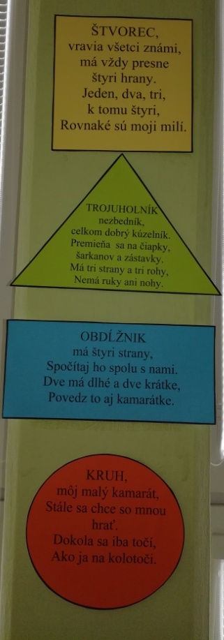 Geometrické tvary s básničkami, vytlačené na farebný papier, zalaminované zavesené na stenu.